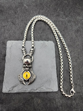 Die Halskette beinhaltet bereits den passenden Edelstahlanhänger mit dem gelben Auge eines Drachen und einem Totenkopf verziert. Die Edelstahlkette ist ebenfalls an beiden Enden mit kleinen Totenköpfen geschmückt, passend zur ganzen Edelstahlhalskette.