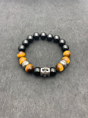 Das Armband besteht aus Edelstahl, Onyx glänzend, gelbes Tigerauge.