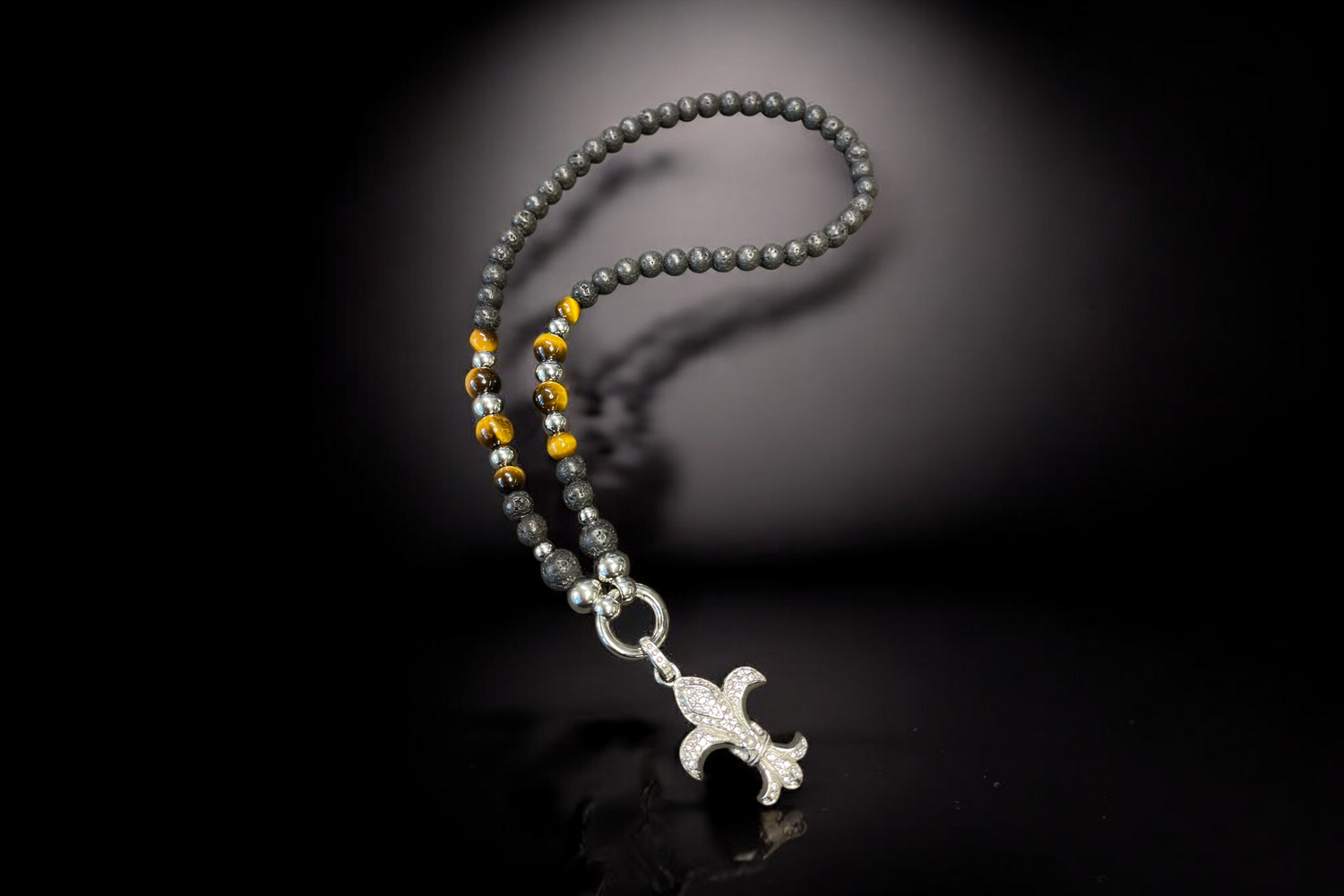 Lava Rock steht traditionell für Erdung, Stabilität und ruhige Stärke und bringt die matte, schwarze Tiefe ins Design. Gelbes Tigerauge wird häufig mit Fokus, Mut und Selbstvertrauen assoziiert und setzt den warmen, goldigen Kontrast.