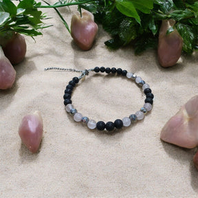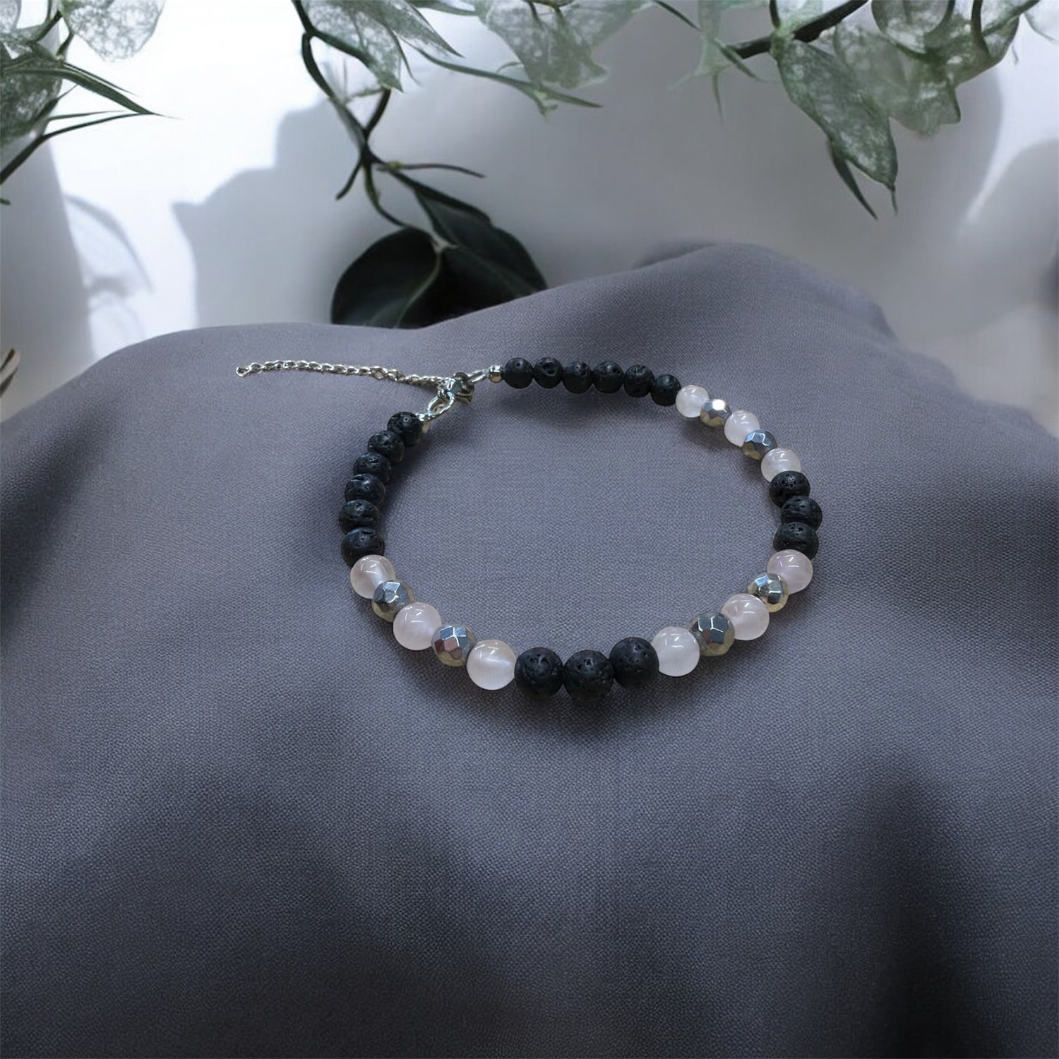 In der Kombination treffen raues Schwarz und zartes Rosé auf kühlen Metallglanz – stark, aber gleichzeitig fein abgestimmt. Als Begleiter erinnert die Fusskette daran, geerdet zu bleiben und trotzdem offen, ruhig und klar durchs Leben zu gehen.