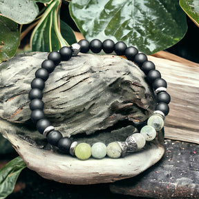 Das Armband besteht aus Edelstahl, Onyx matt, Jade grün/weiss.