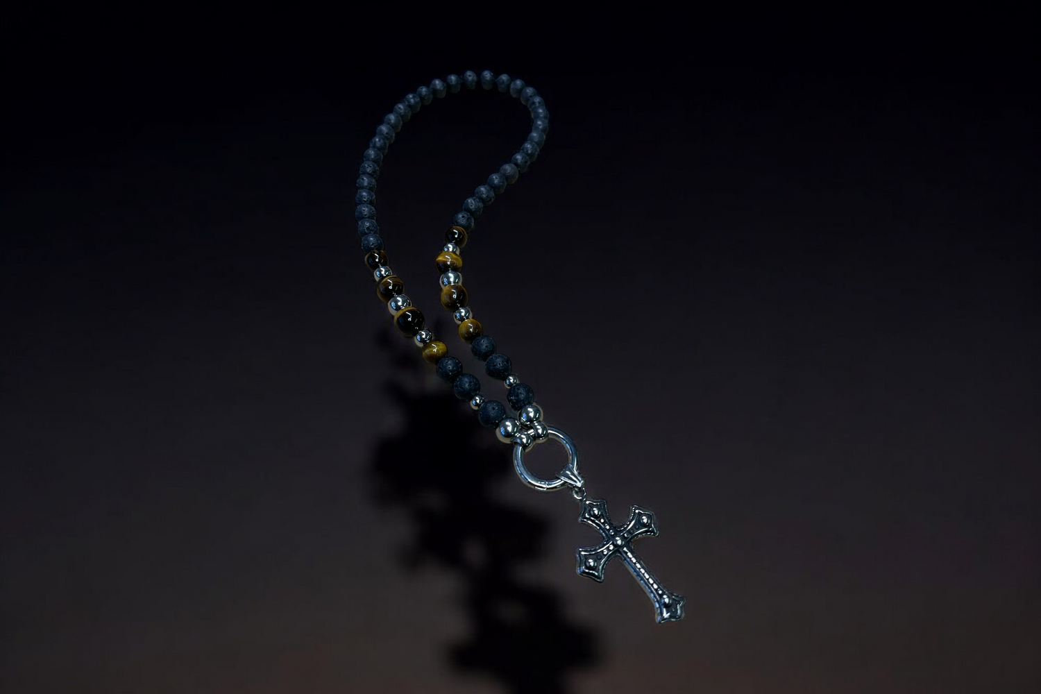 Lava Rock wird traditionell mit Erdung, Stabilität und ruhiger Stärke verbunden und sorgt für die matte, tiefschwarze Präsenz. Gelbes Tigerauge setzt den warmen Kontrast und wird häufig mit Fokus, Mut und Selbstvertrauen assoziiert.