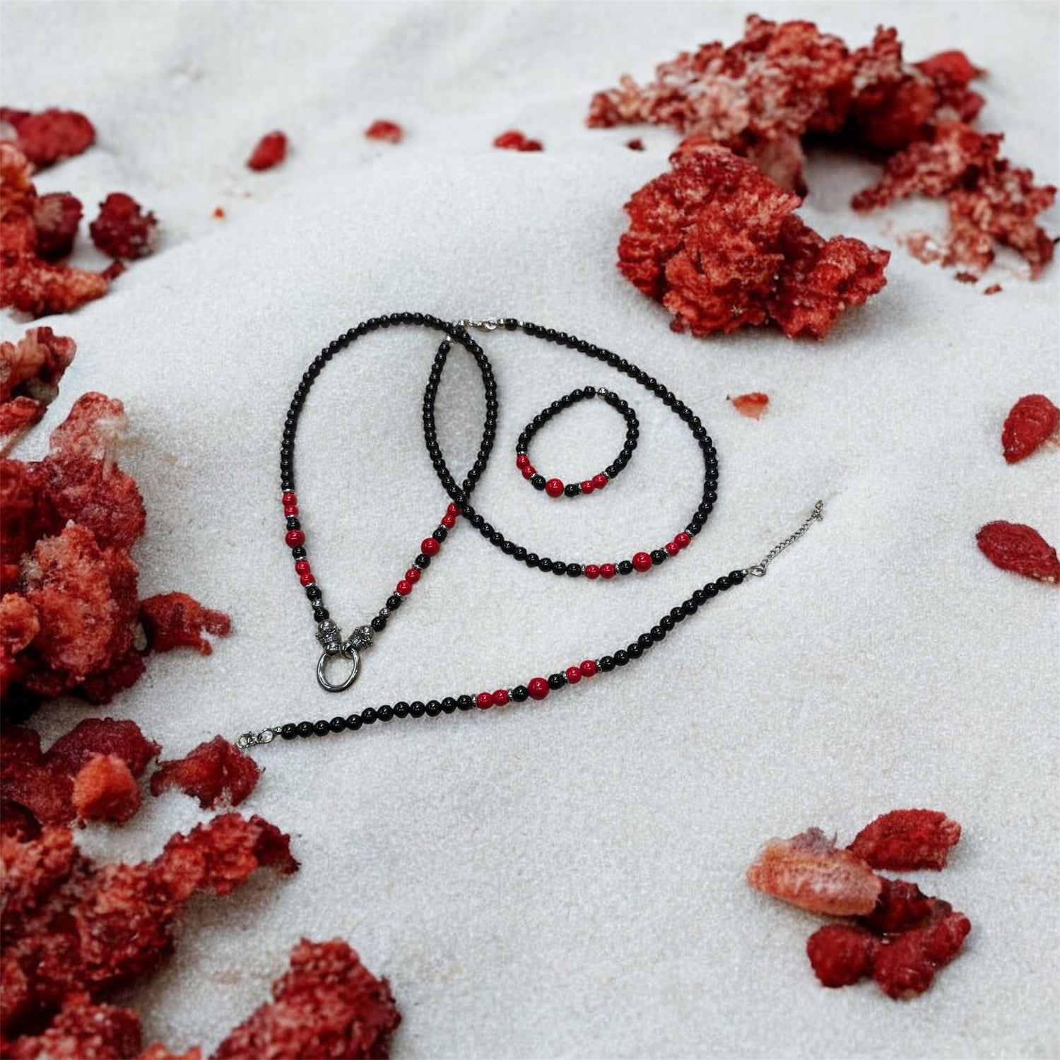 Die Halskette besteht aus Edelstahl, Onyx glanz, rote Koralle.