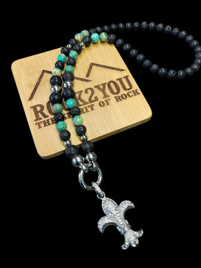 Zusammen entsteht eine Halskette, die kraftvoll und natürlich wirkt: dunkel, geerdet und mit einem grünen „Fire“-Highlight für echte Statement-Vibes.