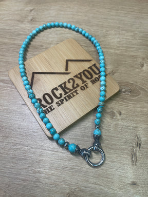 Edelstahl bildet die robuste, langlebige Basis und sorgt für einen modernen, rockigen Look. Türkis wird traditionell als Schutzstein gesehen und häufig mit Gelassenheit, Ausgleich und positiver Energie verbunden. Seine leuchtend blaugrüne Farbe erinnert an klares Wasser und setzt einen starken, lebendigen Akzent am Handgelenk.