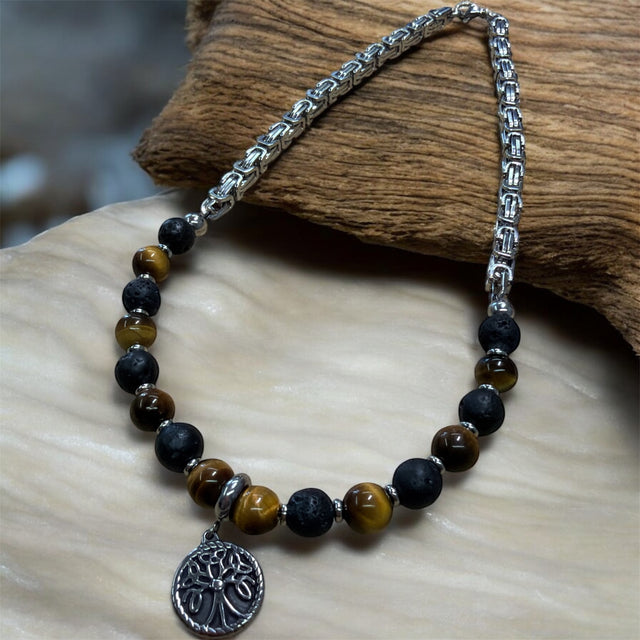Die Halskette besteht aus Edelstahl, Lava Rock, Tigerauge gelb.